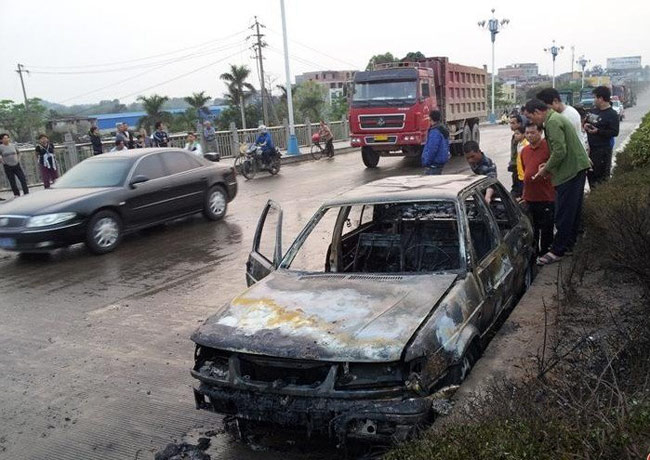 多人围观自燃后的车