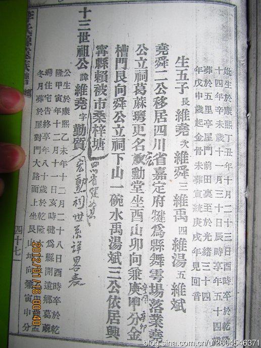 十三世祖公:讳:“维尧”,字“勤質”,于乾隆三十四年移居四川省嘉定府犍为县舞云场