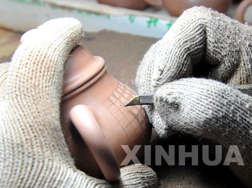 钦州一家坭兴陶制作企业的员工在坭兴陶茶壶上雕刻古诗词