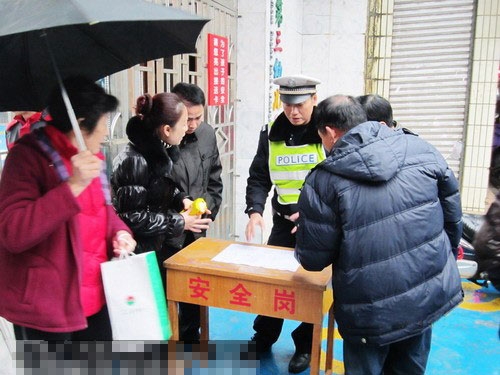 多名交警冒雨拿着宣传单,宣传“单行线”和“禁左”