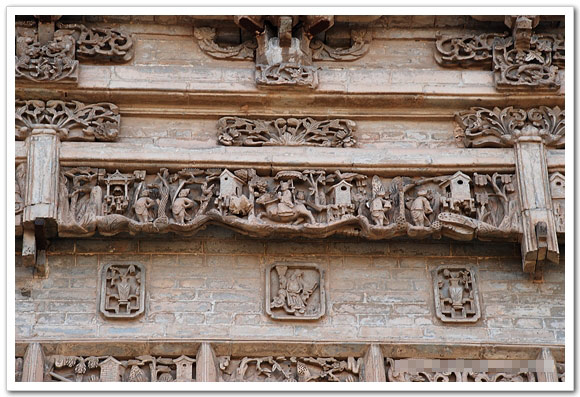 匾额上面贯穿整个正面的石雕,里面雕刻人物、动物,各种兽类、订台楼阁、庄稼,街头打耍,每个雕刻都是一串故事,非常的精美。
