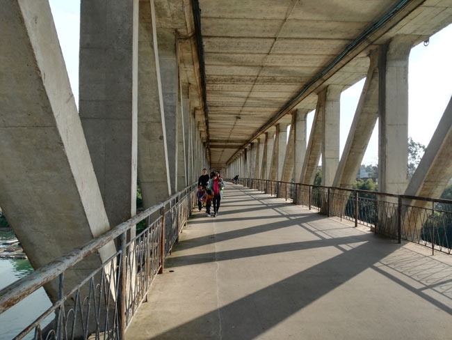 桥分两层,上面通汽车,桥中层为人行和摩托行走