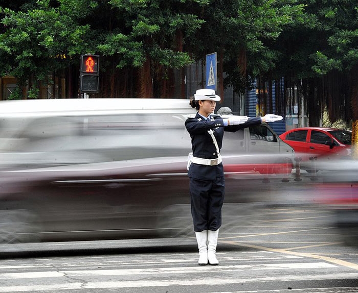 车流中正在执勤的90后“警花”