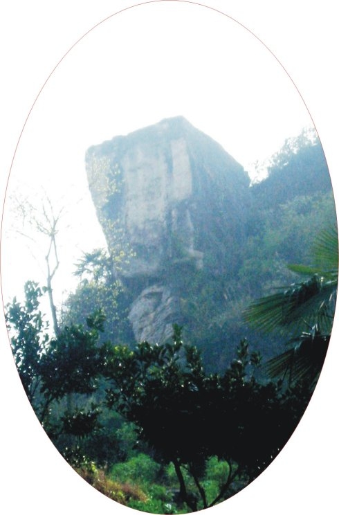 官斗石是自然生成还是人工凿成?没有资料可考。不过,它极象一个倒立的大印。印面朝上,印把植于山岩下面,上面一节与山分离,数百米远也能看得清楚象个方印,下面部分与山相连,高数十米。据老前辈讲,印把上还有以前官府刊刻的文字呢!
