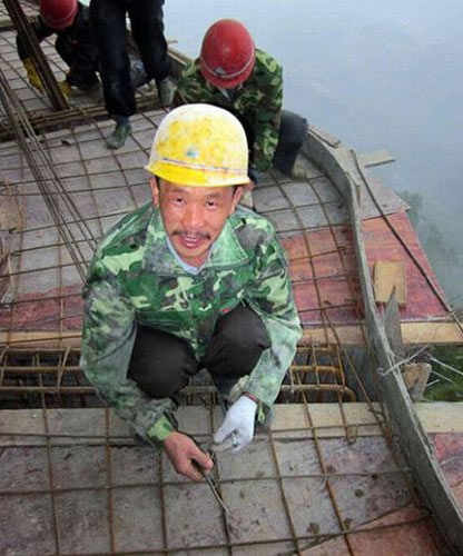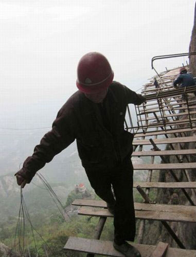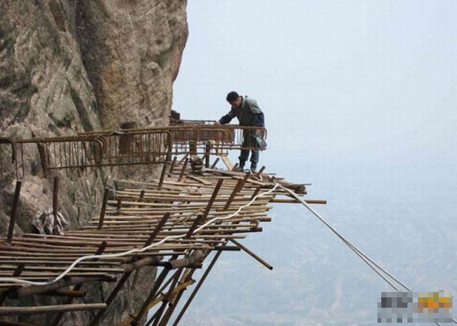 悬崖绝壁上铺路的农民工