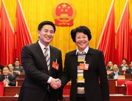 新当选的钦州市人大常委会主任肖莺子(右)与钦州市人民政府市长李新元(左)