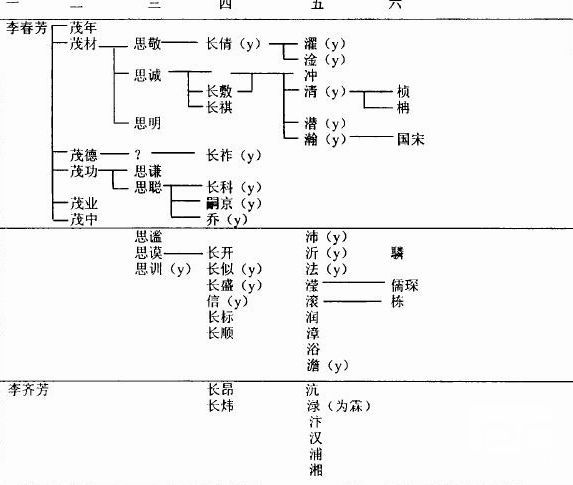 (五)“简表”第三栏中,实际世系可确定者有:李茂功一族者:李流,李思横孙,李  国楷父。字方叔,贡生,授府通判。