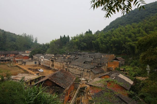 村口,一群建筑便呈现在眼前。只见房屋新老交替排列着,四面环山,被笼罩在一片郁郁葱葱中。其中,有一座大型联体古建筑,一面至少20米长的墙上,仅有三个小门,正中间的那一扇门上隐约显现四个大字——“盘古风清”。