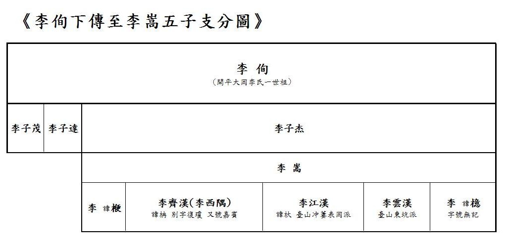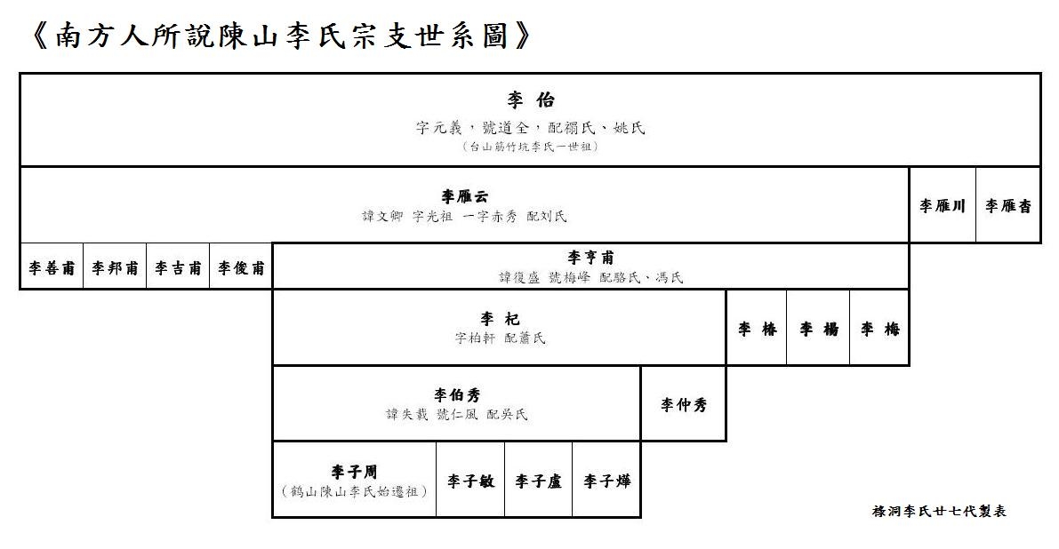 根據南方人資料,祿洞李氏廿七代製《李侚下傳至李嵩五子支分圖》表