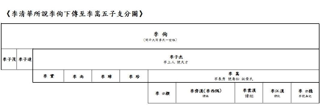 根據李清華資料,製《李清華所說李侚下傳至李嵩五子支分圖》表